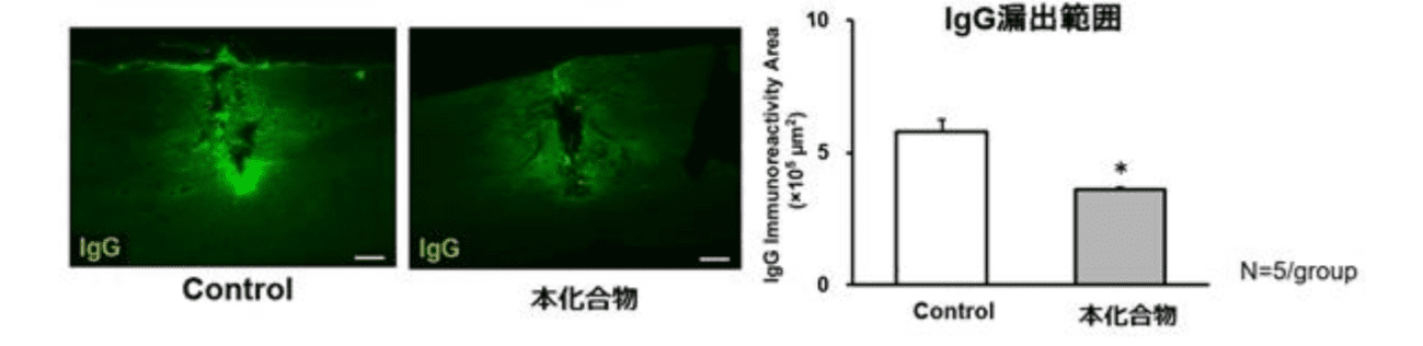 各薬剤を腹腔内投与後、マウス頚髄に脊髄損傷を作成、再度薬剤を投与し、翌日に灌流固定を行った。損傷周囲の IgG 漏出を組織学的に定量した。候補の4剤は有意に IgG 漏出を抑制していた(IgG 漏出は BBSCB 機能破綻を示す)。薬剤 投与量は 1mg/kg/回。