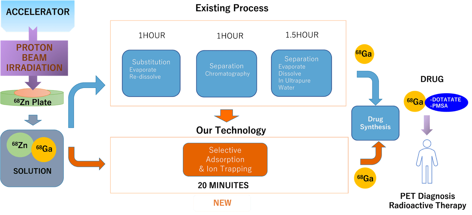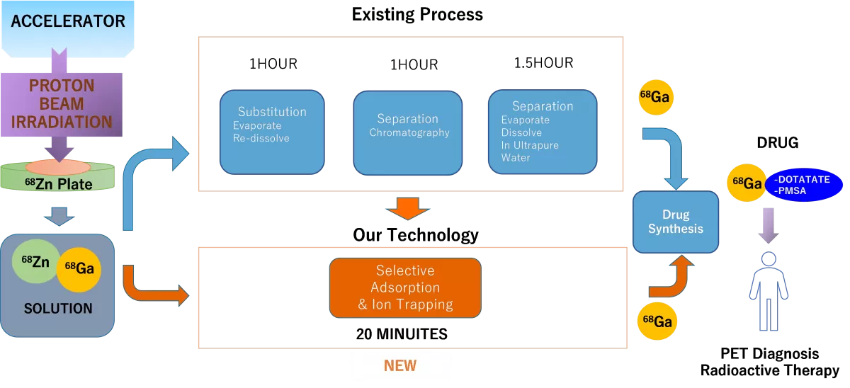 そのようなRIとして、Ga-68などが放射性医薬品として開発され、具体的には、神経内分泌腫瘍用68Ga-DOTATATE、前立腺がん用68Ga-PSMAがPET/CTに臨床応用され世界規模で需要が拡大している。