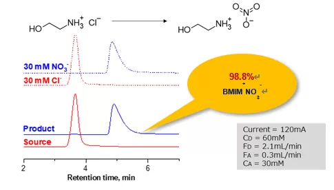 ・ 純度>98%(98.8% BMIM+NO3-)、アニオン・カチオン両ソースの変換率は平均99%