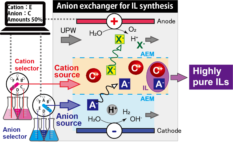 陽イオンと陰イオンの組み合わせからなり、常温で液体である「イオン液体」は、水、有機溶媒に続く第3の溶媒といわれ、化学反応や分離の場、熱媒体、電池内部液などへの応用が進められているが、イオン液体(C+A-)の合成は、水や沈殿を生成する陰イオン(OH-やCl-など)や陽イオン(H+やAg+など)を対イオンとした2つの原料物質(たとえばC+Cl-とAg+A-)を用意し反応させる必要があり、高純度のイオン液体を得るためには、生じた副生成物(AgClやH2Oなど)を完全に取り除かなければならなかった。