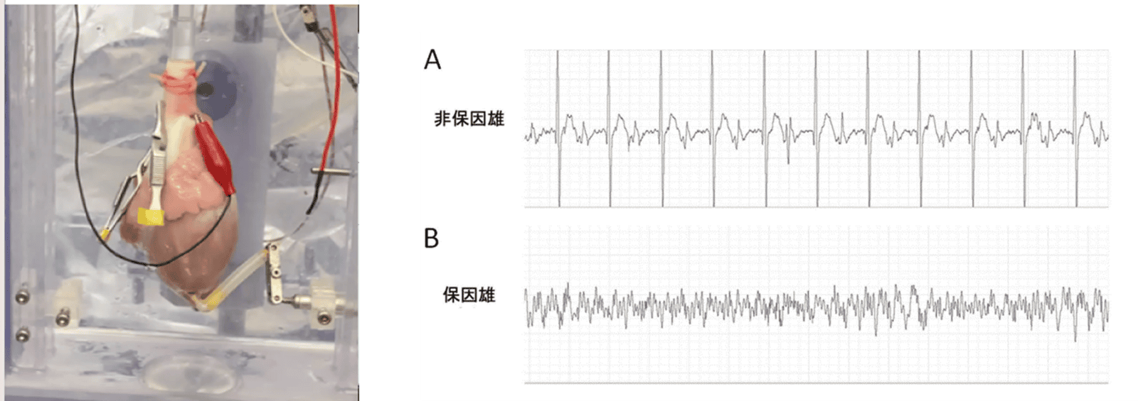 BMD心筋症モデルブタからの摘出心を氷冷し、心停止液に漬け、ヘパリン3mL(1000U/mL)摘出心に注入した。大動脈からカニューレを挿入し、灌流装置に摘出心を装着し、灌流を開始した。心臓の色が変化した後、除細動器による電気ショックで摘出心を再拍動させた。その後、電極を心尖部および心底に装着し、心電図記録を開始した。