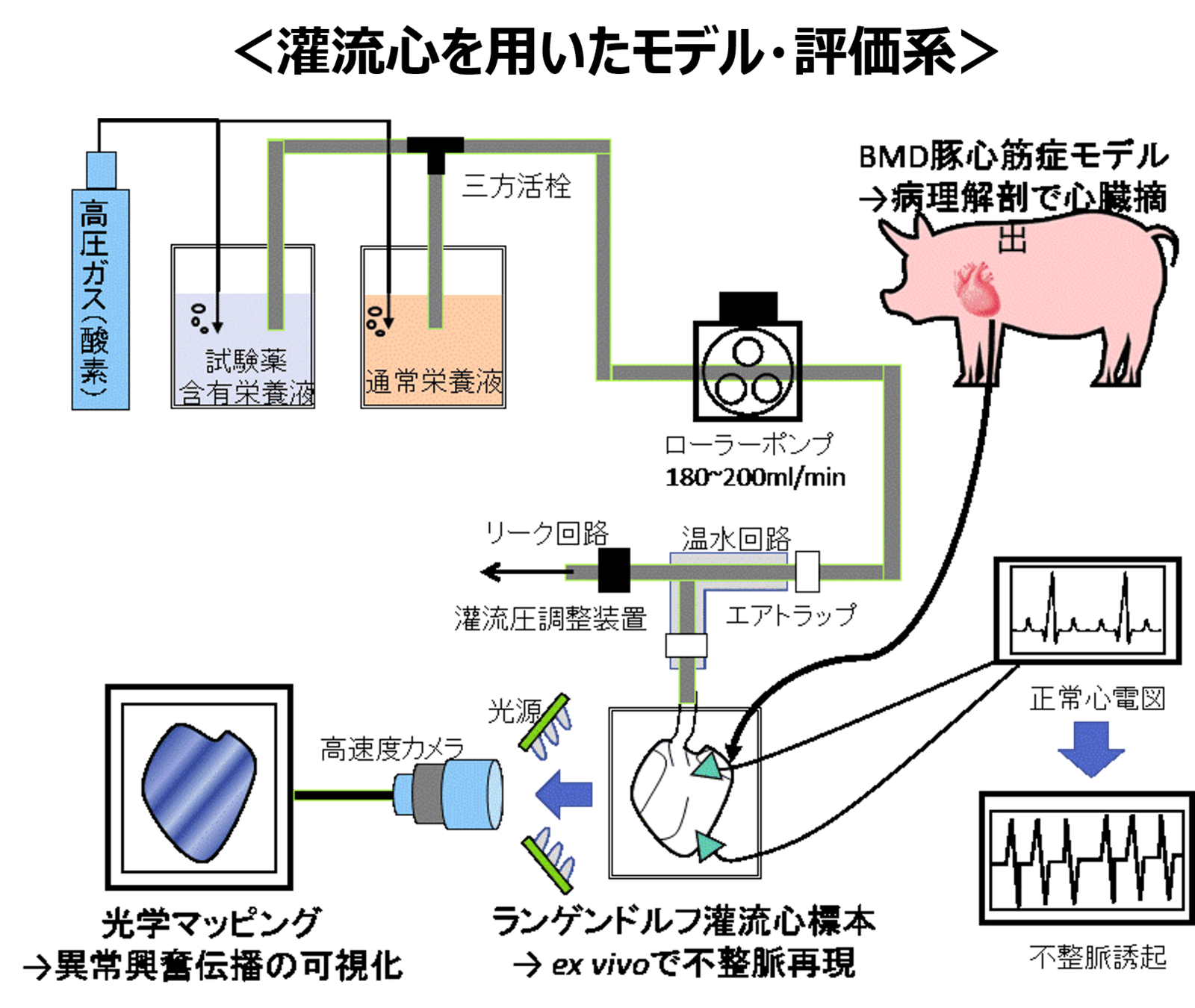 麻布大学にてベッカー型筋ジストロフィー(BMD)の表現型・心筋症を示す変異を持つ保因家系ブタが発見され、この家系を固定し維持している。本技術は、このBMD心筋症ブタモデルから摘出した心臓組織標本を心停止後灌流し、再拍動させた後、拍動を維持する方法を確立し、ex vivoモデル心臓として再現された。この灌流心は、揮発性麻酔薬(例えば、イソフルラン)とカテコールアミン(例えば、アドレナリン)を、この順序で灌流することで不整脈が誘発される。