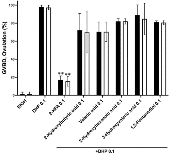 2-HPAに加えて、2-ヒドロキシ酪酸(2-Hydroxybutyric acid)、吉草酸(valeric acid)、2-ヒドロキシヘキサン酸(2-Hydroxyhexanoic acid)、1,2-ペンタンジオール(1,2-Pentanediol)及び3-ヒドロキシ酪酸(3-Hydroxyvaleric acid) を用いて行った結果、2-HPAのみが、動物個体において卵母細胞の成熟及び排卵を阻害できることが示された。