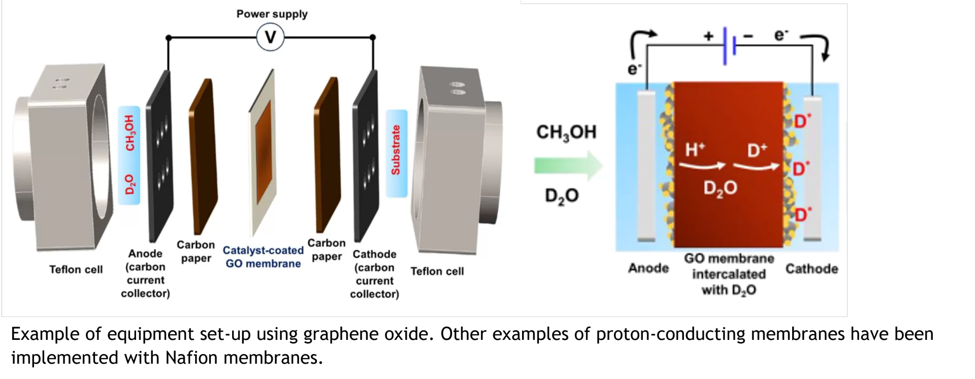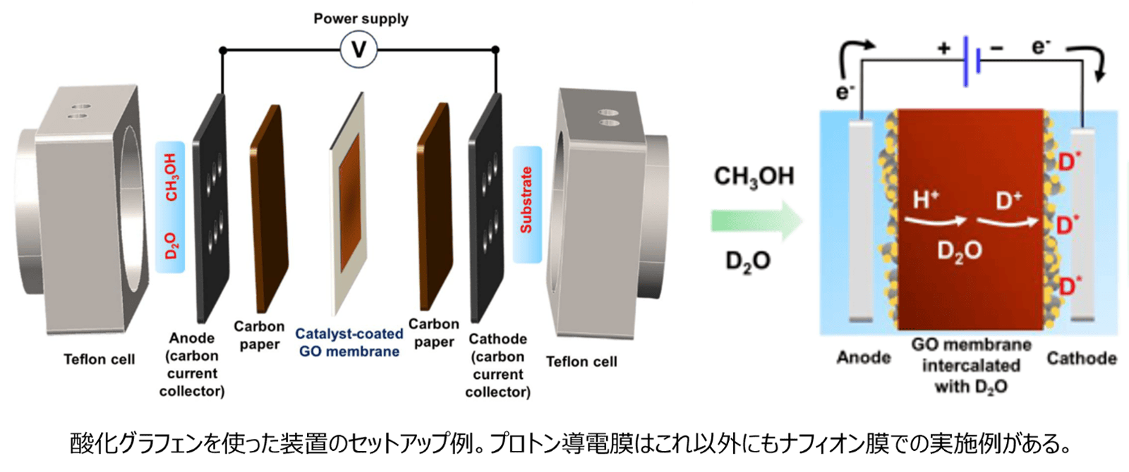 具体的には、プロトン導電膜に電極を取り付けた新たな膜型反応器によって、プロトン導電膜のアノード側に重水(D2O)及びプロトン供給源を供給し、プロトン導電膜のカソード側に重水素化する化合物を供給するというコンセプトの装置である。プロトン電動膜としては、現時点でナフィオン膜や酸化グラフェン膜を用いている。プロトン導電膜に通電することにより、アノード側においてプロトン供給源と重水を電気化学的に酸化してH+/D+としてプロトン導電膜を経由し、カソード側に通過するD+/D2と重水素化する化合物とを反応させることによって、重水素標識化合物を電気化学的に合成する方法が提供される仕組みである。