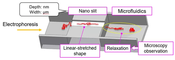 今回、研究者らは、DNA分子を外力により伸長し、再び戻るまでの緩和時間を測定することに基づく新しい方法を開発した。緩和時間は分子数に依存することが報告されており、緩和時間から分子サイズを同定することは、微量サンプルでの解析や解析の前処理、解析時間の短縮が期待される。本デバイスにおいて、DNA分子はマイクロ流路中でランダムコイル状の形態となっているが、電圧印加によりナノスリットを通らせ、分子を一次構造に引き延ばし、電圧印加を止めた際にそれが再びランダムコイル状に戻るまでの緩和時間を光学顕微鏡観察により測定する。