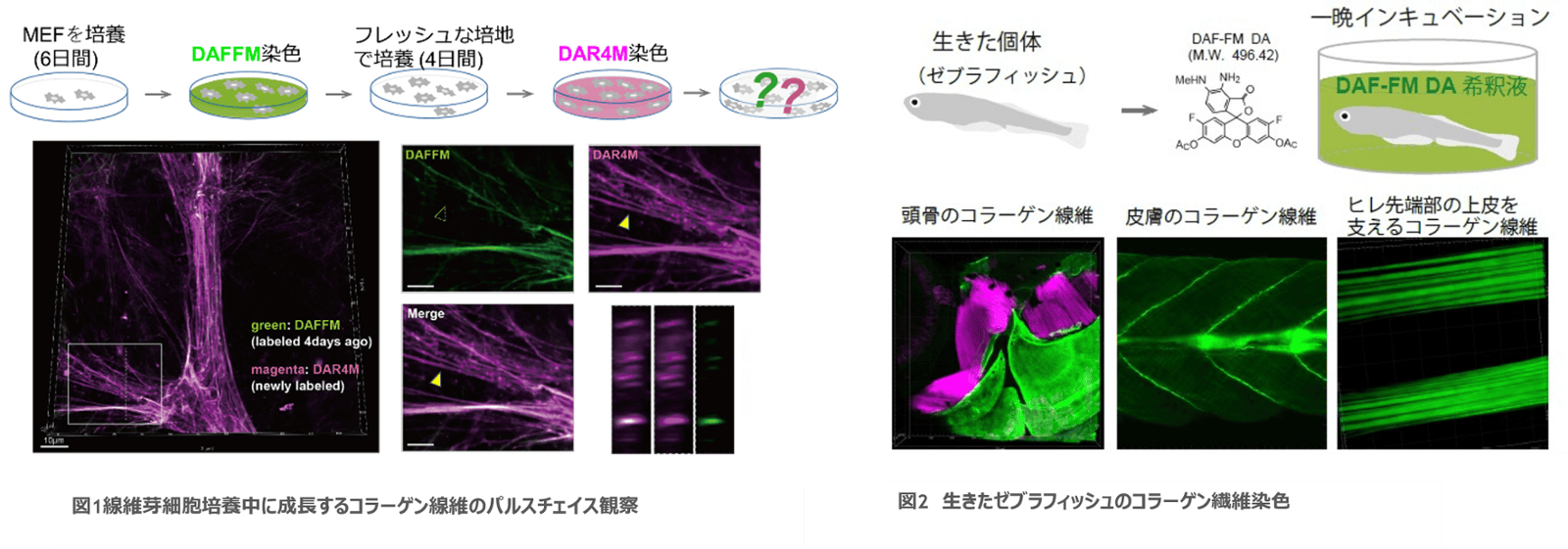 蛍光プローブ(DAF-FM、DAR-4M)を用い、生体組織内のコラーゲン線維の動態を長期間にわたり追跡・観察も可能な新しい手法。