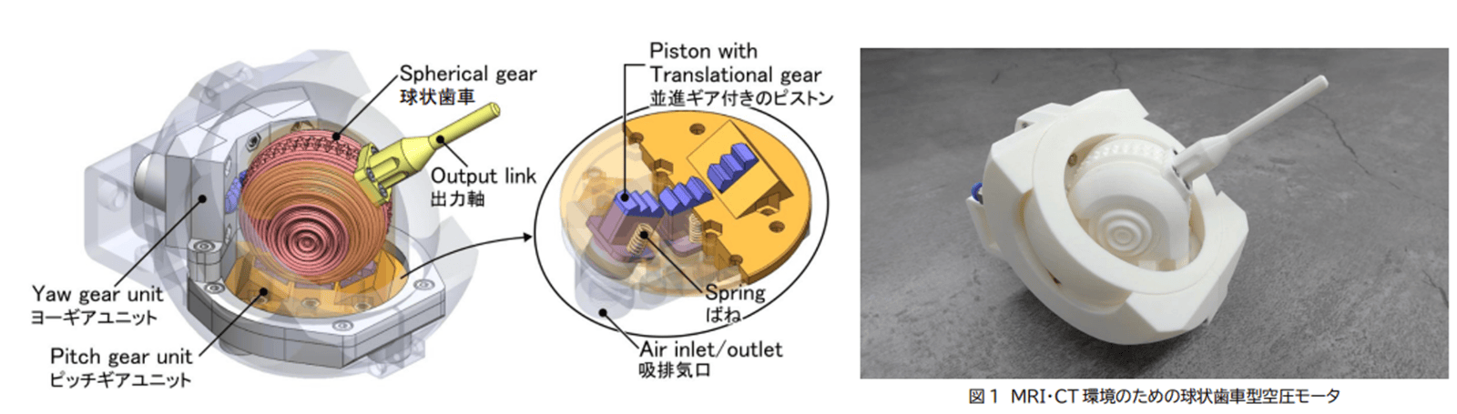 本プロジェクトでは、これらの課題解決を目的に1台で様々な方向への回転を実現する球状歯車型空圧アクチュエータ(下図)を開発した。本アクチュエータの特徴として、中心に配置した球状歯車には、ヨー方向回転(左右方向の回転)とピッチ方向回転(上下方向の回転)のそれぞれで異なる歯車形状が設けられている。ヨー方向回転時にピッチギアユニットが従動してヨー方向回転することで、ピッチギアユニットと球状歯車の噛み合い関係が維持される。さらにピッチ方向回転時にヨーギアユニットが球状歯車に干渉しない構造のため、2軸同時回転が実現可能となっている。今回開発した回転機構は、従来にはない構成の回転機構であり、小型化や軽量化が期待できる新たな機械部品として、開発当初に想定していた医療機器用途だけでなく、産業用途における位置決めや姿勢制御を行う用途などでの活用も期待される。