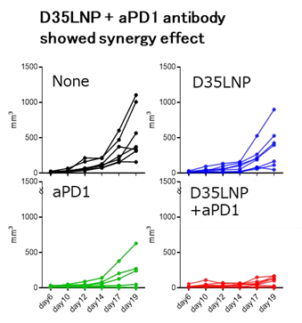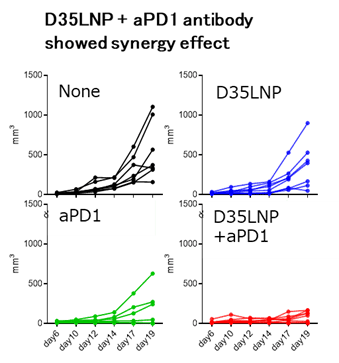 - D35LNPにより、免疫療法に耐性を示す腫瘍を反応応答性に転換することに成功した。