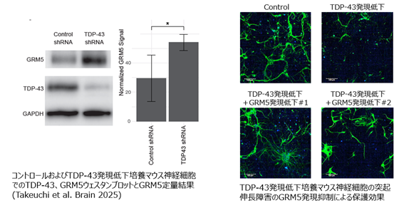 本研究では、TDP-43病理を示すALS患者組織を解析し、グルタミン酸代謝型受容体(mGluR5)の発現が著しく増加していることを発見しました。さらに、TDP-43の発現低下を誘導した培養マウス神経細胞では神経突起の著しい短縮が観察され、mGluR5の発現を抑えることでこの異常が改善されることを確認しました。