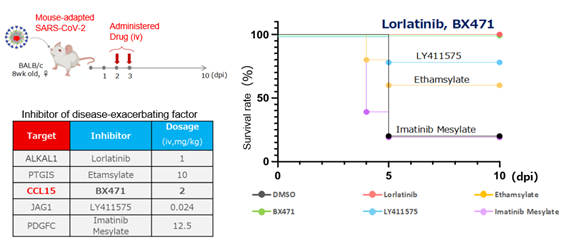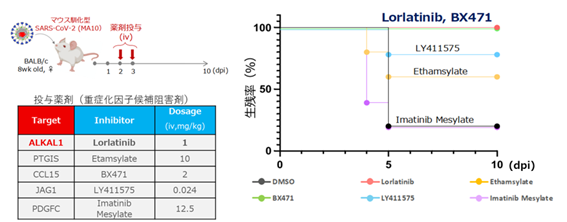 マウス馴化型SARS‑CoV‑2(rMA10)の致死的肺炎モデルにおいて、Lorlatinib投与群で生存率の有意な改善が得られた。(図)