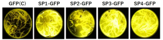 現在、大阪大学の研究チームではタバコ(Nicotiana benthamiana)の毛状根を用い、新規に発見したシグナルペプチド(SP)をモデルタンパク質GFPに付加し、効率的な分泌生産に成功した。培養液全体が強い蛍光を示すことから、大量かつ安定的に培養液中へ分泌されることを確認した(下図)