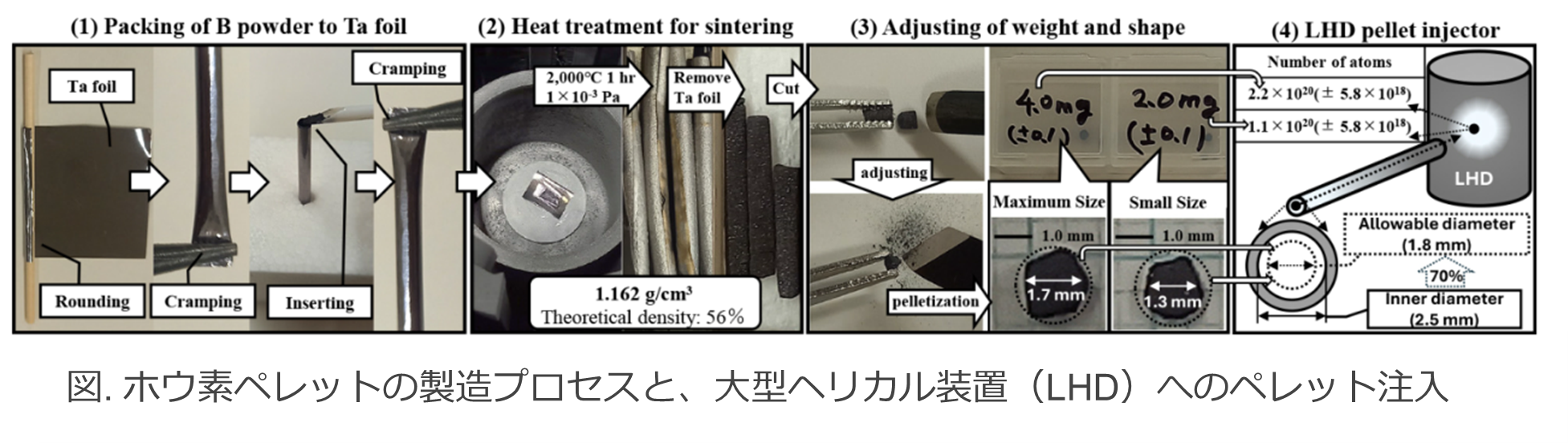 また、核融合炉研究分野においても、ホウ素は次世代核融合燃料や中性子遮蔽材として重要な材料である。一方で、その加工性の悪さから、燃料用ペレット成形に用いられるカプセル工法には、不純物汚染やホウ素充填効率の低さといった問題があった。本研究者らは、この課題に対し、仮焼結状態で一時的に加工可能硬度を保持させ、機械加工後に本焼結へと移行する二段階プロセスを開発した。特にタンタル箔に材料を充填、焼結することで、不純物汚染を抑え、高純度焼結体を得られることを見出した。