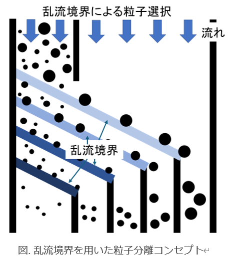 試験機レベルでは、数μmオーダーの粒径閾値による分離を達成しており、サブミクロン〜数十ミクロンの粒子を対象とした高精度な粒径選択性が確認されている。電子材料スラリー、微粒子評価、バイオ関連サンプルなど、精密なサイズ制御が求められる用途への展開が想定される