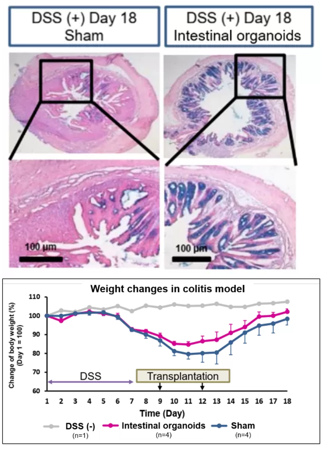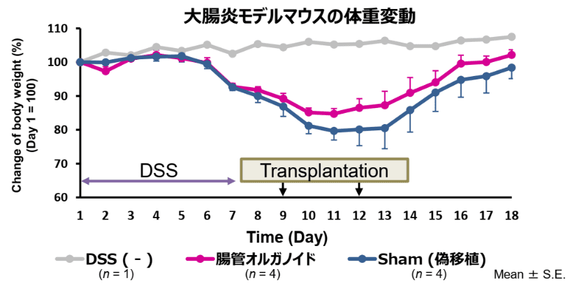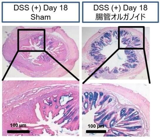- 1週間のDSS飲水投与で腸炎を誘発したマウスに対して、9日目と12日目にiPS細胞由来腸管オルガノイド細胞懸濁液を肛門から注入したところ体重回復、腸管組織のムコ多糖産生の亢進が認められた