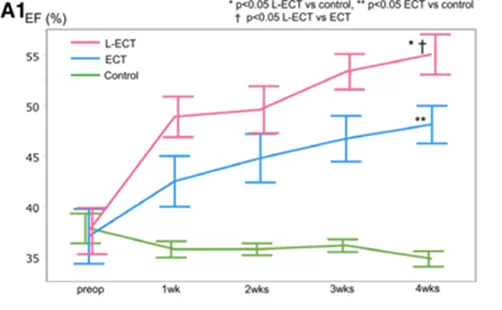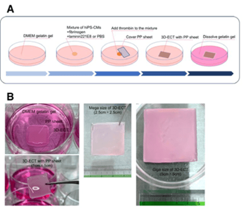 üラットの心筋梗塞モデルに、心筋梗塞を起こさせてから2週間後、iPSから誘導した心筋細胞を含んだフィブリン細胞シート(ECT)を心筋の傍梗塞部位の表面に貼付して移植した。移植後1週間おきに4週目まで心機能(収縮能、収縮期末期径、拡張期末期径)の評価をエコー検査で行ったところ、フィブリンシートを移植したラットでは移植後4週間の間に心機能の有意な改善が認められた。またラミニンを含ませたフィブリン細胞シート(L-ECT)はさらに治療効果が高まった。