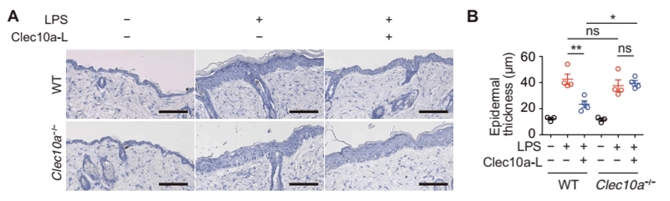 WTおよびClec10a-/-マウスの背側皮膚にLPSを塗布し、Clec10a-Lを添加、または添加しない群においてH&E染色(A)と5日目の表皮の厚さ(B)について比較したところ、HDM由来のClec10a-LはWTマウスにおけるLPS塗布による皮膚炎を改善した。