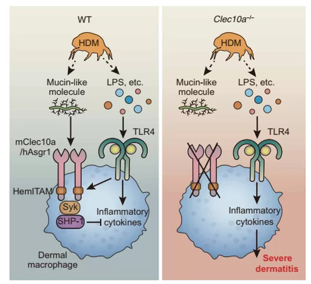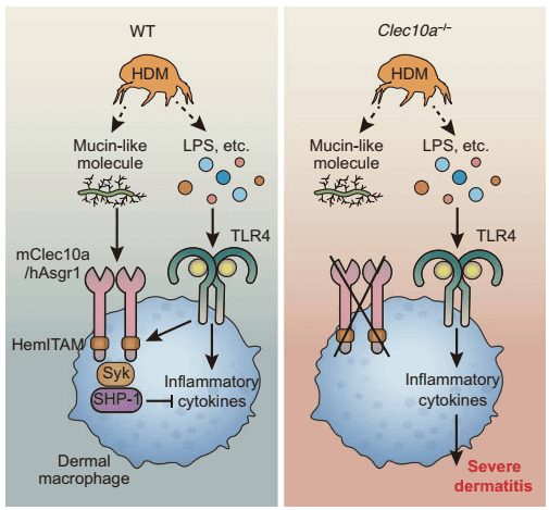 HDMによる皮膚炎は、TLR4を介した炎症反応によって引き起こされ、ヒトではAsialoglycoprotein receptor 1 (Asgr1)がClec10aのホモログとして機能していた。