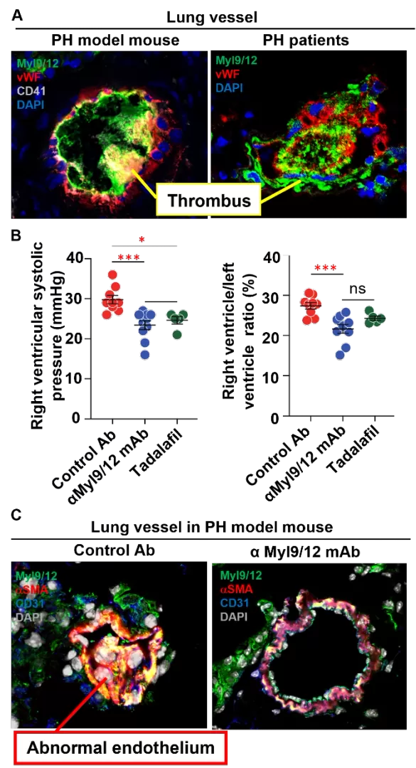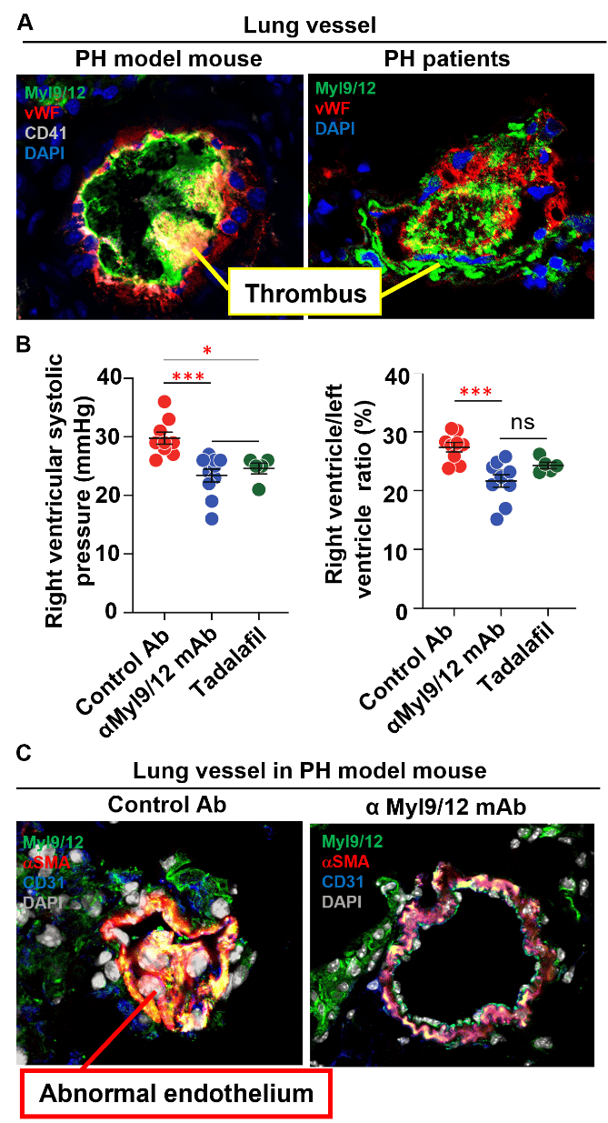 - 肺高血圧症マウスモデルに対して抗Myl9/12抗体、コントロール抗体、タダラフィル(PDE5阻害薬)を投与した時の右室収縮期圧と右心室と左心室の重量比(B)とαSMA陽性血管内皮細胞の観察(C)
