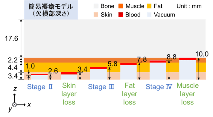 発明者らは、ベッドのマットレスの下からマイクロ波(5.8GHz・10GHz)を体に照射し褥瘡のステージを非接触・非侵襲で検出する方法を開発した。作製した褥瘡の各ステージの42種類の皮膚モデル(右上図)に対して患部に当たったマイクロ波の反射時間と大きさを指標とした値を生成し、健康皮膚モデルとの差分から欠損部の深度と表面積(辺の長さ)体積を推定できることを明らかにした。