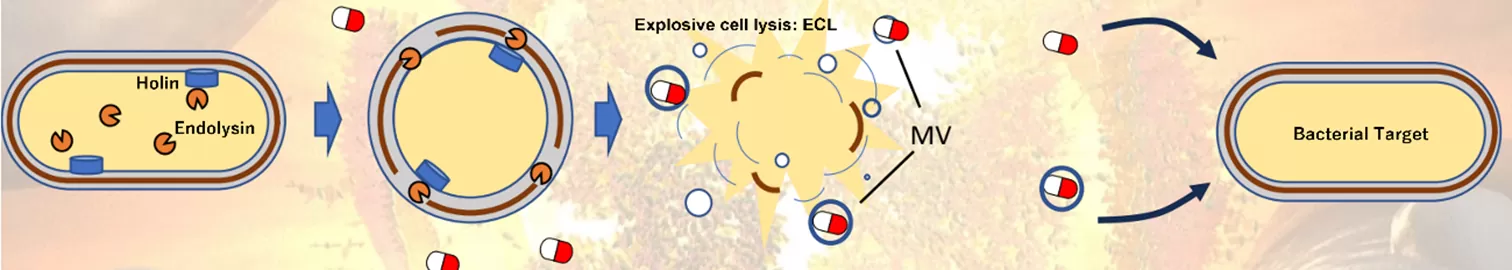 本発明者らは、グラム陰性細菌が膜小胞を形成する機構を利用して、対象物質を効率よく取り込んだ膜小胞を作製する方法を確立した。これはグラム陰性細菌の細胞中で細胞壁分解酵素であるエンドリシンの発現量が一定以上になると細胞が破裂性溶菌(Explosive cell lysis: ECL)を起こして細胞死を起こし、それにより放出された細胞膜断片が再会合して膜小胞が形成されることを利用した方法であるが、エンドリシンを強制的に発現させることにより、ECLは効果的に誘導されることも明らかにした。さらに、ECLを誘導する際に培地に標的物質を含有させておくことで、標的物質が膜小胞に効率よく内包されることを見出した(下図)。これにより抗生物質や核酸医薬、遺伝子編集用のコンポーネントを内包させた膜小胞を作ることが可能になり、特定細菌に対する薬剤治療や遺伝子編集治療の開発が期待される。