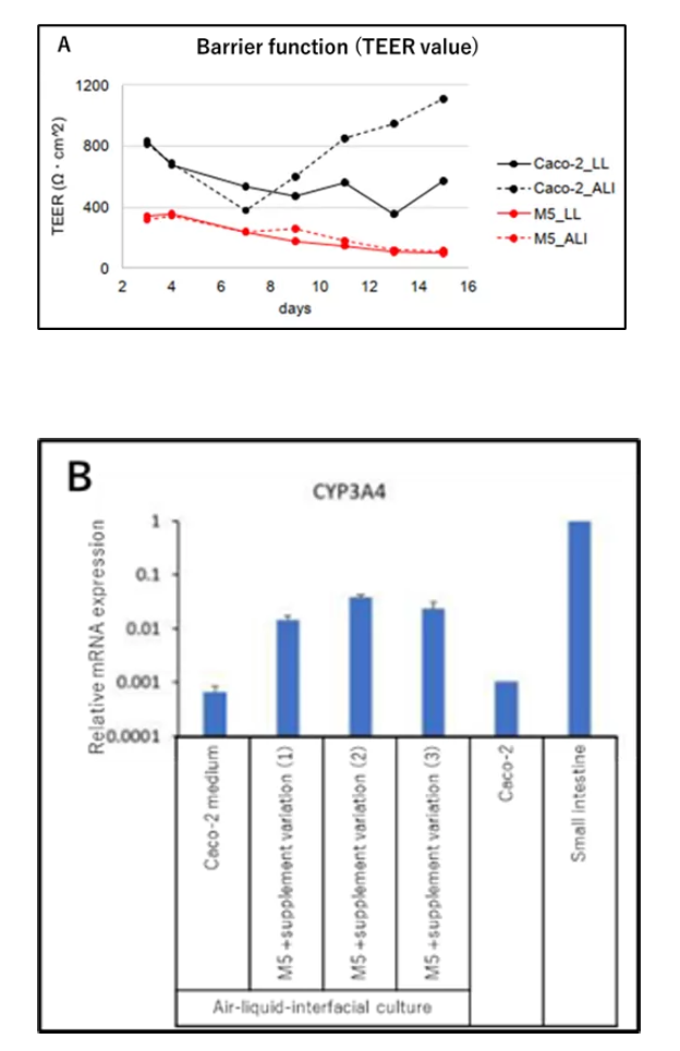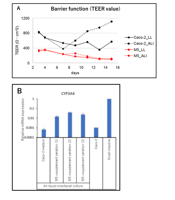 - Caco-2細胞をセルカルチャーインサートに播種し、培地としてCaco-2培地またはサプリメントを添加したM5培地を用いて、気相液相界面培養(ALI)または通常の液相培養(LL)で15日間培養時の、細胞の状態(右図)TEER値(A)ALI培養をした時のCYP3A4遺伝子の発現と小腸細胞との比較(B)