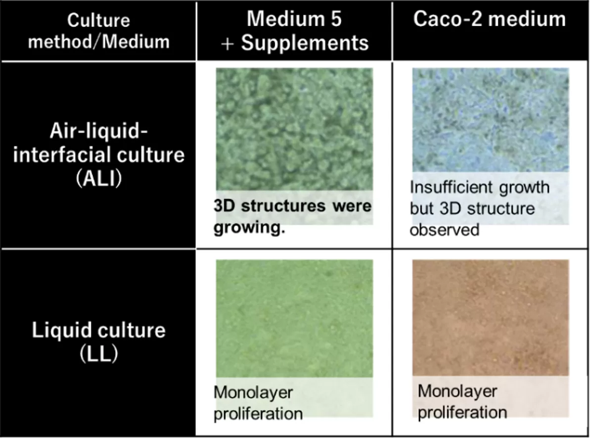 発明者らは、これまでの腸管オルガノイドの誘導培養研究で得られた、Medium5(M5)培地や気液培養の知見をCaco‐2細胞の培養系に応用し、Caco-2細胞を用いて生体腸管に近い凹凸構造を持つ細胞に誘導することに成功した。凹凸構造の形成に必要な培養因子を同定し、それらを含むM5培地で気相液相界面培養することで凹凸構造を形成させ、単層のCaco-2レイヤーに比べて生体腸管に近いTEER値を示すことを確認した。さらに、Caco-2細胞で課題となっていたMUC2や代謝酵素であるCYP3A4の発現量、カルボキシルエステラーゼCES1/CES2比の発現パターンが変化し、生体腸管に近づくことも確認された。本発明により、ヒトの生体系に近い凹凸立体腸管評価系モデルとして安定で安価な供給につながることが期待される。