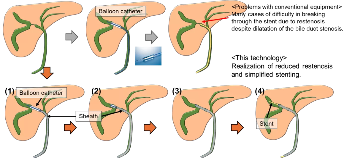膵癌や胆管癌が進行すると胆管が狭くなる胆管狭窄の状態になり、胆汁の流れが悪くなって黄疸や胆管炎を引き起こす。胆管狭窄に対しては内視鏡的胆管ドレナージ(ERBD)によって、内視鏡を用いて胆管にステントを留置することが行われている。ステント留置の標準的な手順は、(1)バルーンカテーテルを狭窄部まで到達させる、(2)バルーンカテーテルの先端部で狭窄部を突破しバルーンを膨らませて狭窄部を拡げる、(3)バルーンをしぼませて抜去し、ステントを挿入して狭窄部に留置する、という流れが一般的である。しかし、この手順(3)のバルーンを抜去しステントを挿入する際に、拡張した狭窄部の再狭窄が生じることが多く、ステントの突破に困難を伴うケースが多い(下図)。