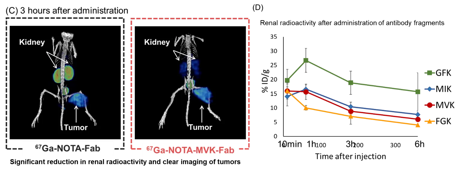RI標識低分子ペプチドは糸球体でろ過されたのちに、近位尿細管細胞内に取り込まれ、リソソーム内でペプチドフラグメントは分解される。一方でRI標識部位を含む放射性代謝物は滞留し、尿中への排出もされにくい(図1)。本発明者らは近位尿細管細胞の細胞膜上にある腎刷子縁膜酵素に着目し、腎細胞内に再吸収される前にRI標識分子が酵素で切断され尿として排出されるような分子設計を着想した。NOTAでキレートしたRI標識分子(67Ga-NOTA)と低分子抗体のFabフラグメントの間に腎刷子縁膜酵素の切断配列であるMVK(Met-Val-Lys)を配置したRI標識低分子抗体(67Ga-NOTA-MVK-Fab)を作製した(図2)。マウスでの投与試験の結果、67Ga-NOTA-MVK-FabのRI標識分子部分(67Ga-NOTA-Met)は腎刷子縁膜酵素に切断され、腎細胞に再吸収されることなく尿として排出させることを確認した。さらに、腎臓に近い場所にある癌組織を明確に画像化することも可能であった(図3)。さらに、発明者らはいくつかの酵素認識配列を試し、その中でマウスの腎臓における蓄積がさらに改善したFGK(Phe-Gly-Lys)配列を見出し、67Ga-NOTA-FGK-Fabも作出した(図4)。