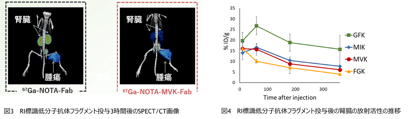 - RI標識低分子抗体をマウスに投与しSPECT/CT画像で確認したところ、67Ga-NOTA-Fabを投与したマウスでは3時間後に腫瘍および腎臓でのRIシグナルが確認されたが(図3写真左)、67Ga-NOTA-MVK-Fabを投与したマウスではRIシグナルは腫瘍のみで腎集積は認められなかった(図3写真右)。
