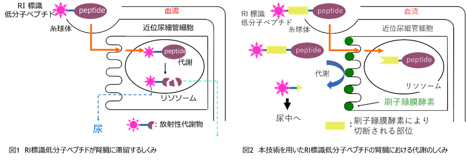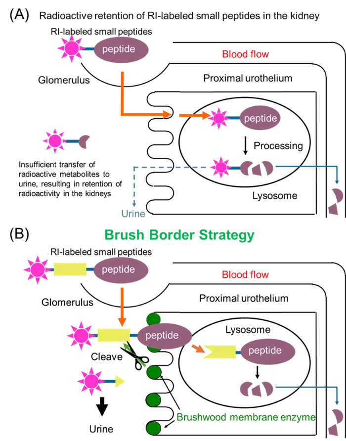 同じ抗体やペプチドに異なる放射性核種(RI)で標識して、癌の画像診断と治療を行うradiotheranosticsの有用性が確かめられ、近年では血液クリアランスを改善させるために、抗体のFabフラグメントなどを用いたRI標識低分子ペプチドの開発が進められている。一方で、RI標識ペプチドは近位尿細管細胞内に取り込まれるため、腎臓に長時間滞留することで、画像診断精度の低下や腎毒性が問題となっていた。