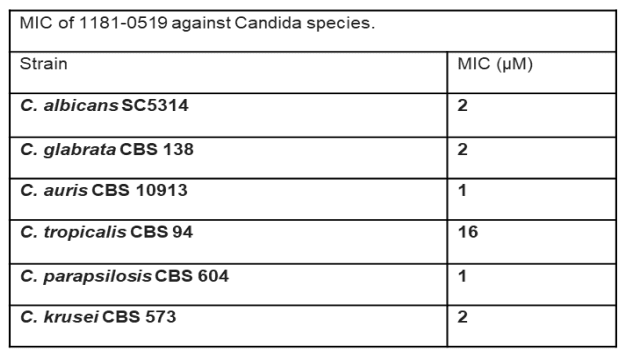 - ERG25の阻害剤である1181-0519はC. albicans、C. glabrata、C. auris、C. parapsilosis、C. kruseiに対して強い阻害活性を示し、最小阻害濃度(MIC)は2μM以下であった(下表)