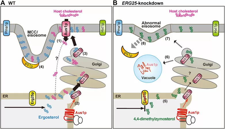 発明者らは、エルゴステロール合成経路に関与する酵素遺伝子であるERG25が真菌のコレステロール取り込みと細胞膜の構造に重要な役割を果たすことを明らかにした(図)。ERG25をノックダウンしたCandida glabrataはステロール輸送タンパク質Aus1pの細胞膜局在を妨げ、感染したマウスの致死率を低下させた。