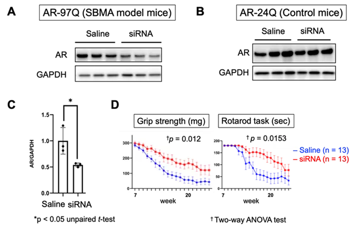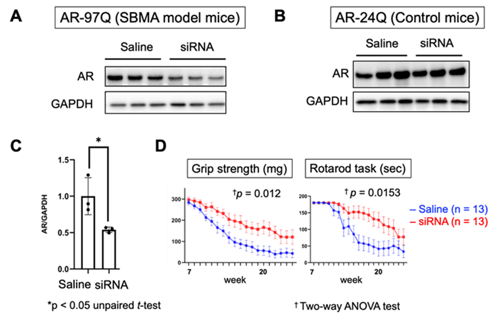 - SBMAモデルマウス(AR-97Q)にsiRNAを投与したところ、投与7日後の脊髄組織において変異ARのノックダウンが確認され(A,C)、また生理食塩水を投与した対照群に比べ運動機能の改善が認められた(D)。一方、siRNAは正常AR(AR-24Q)を有するマウスにおいてはAR発現量に影響しなかった(B)。