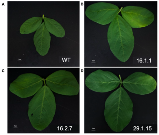 ・ダイズにおけるin plantaゲノム編集:光周性や開花時期に関与するGmPPD1およびそのホモログGmPPD2を標的としたin planta型ゲノム編集を実施した結果、標的配列に挿入・欠失・置換を含む多様な変異を確認した。得られた変異はT1世代においても継承され、葉の大型化などの表現型変化も観察された(図)。