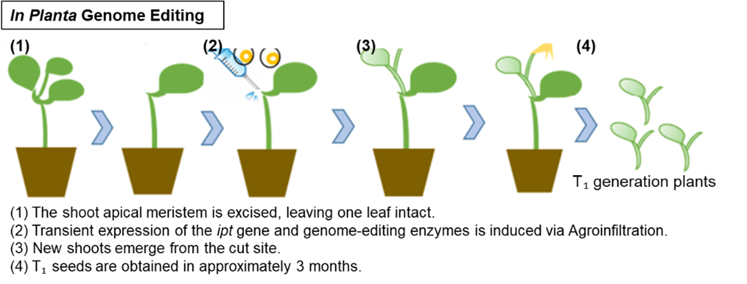 一般的なゲノム編集による植物遺伝子改変には、形質転換体の作出や組織培養が必要であり、特にダイズやミヤコグサなど組織培養が困難な植物種では、ゲノム編集の適用が難しいとされていた。