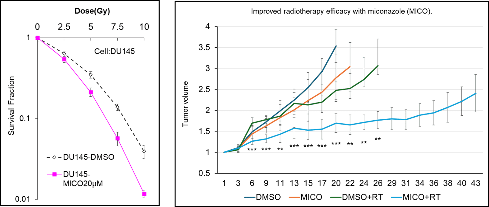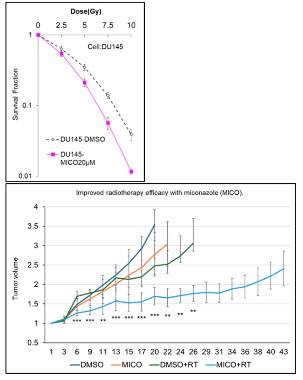 - ミコナゾール(MICO)投与による放射線治療(RT)の効果増強:DMSO投与群、ミコナゾール単独投与群(MICO)、放射線単独治療群(DMSO+RT)、およびミコナゾール併用放射線治療群(MICO+RT)の4群において、腫瘍体積の推移および生存率を評価した結果、ミコナゾール併用群では、RT単独と比較して有意な腫瘍抑制および生存率の改善が認められた。