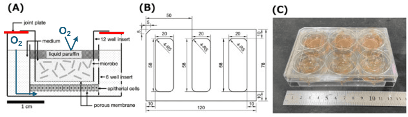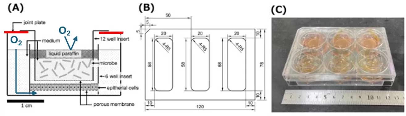 発明者らは6ウェル/12ウェルプレートに細胞培養用のトランスウェルを設置し、さらに径の小さい微生物培養用のトランスウェルを重ねるためのアタッチメントを考案した(下図B)。市販のプレートとウェルを用いる、シンプルな共培養システムによって、(1) 共培養中の培地を自由にサンプリングできる(2) 微生物と培養細胞の成長を時間とともにモニタリングできる(3) 好気-嫌気共培養が可能(4)簡便な操作で複数のサンプルを同時に評価できるようになった。