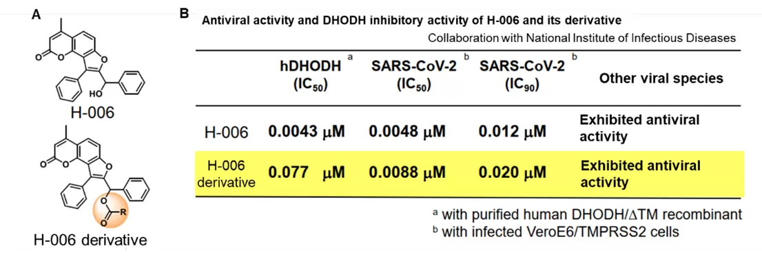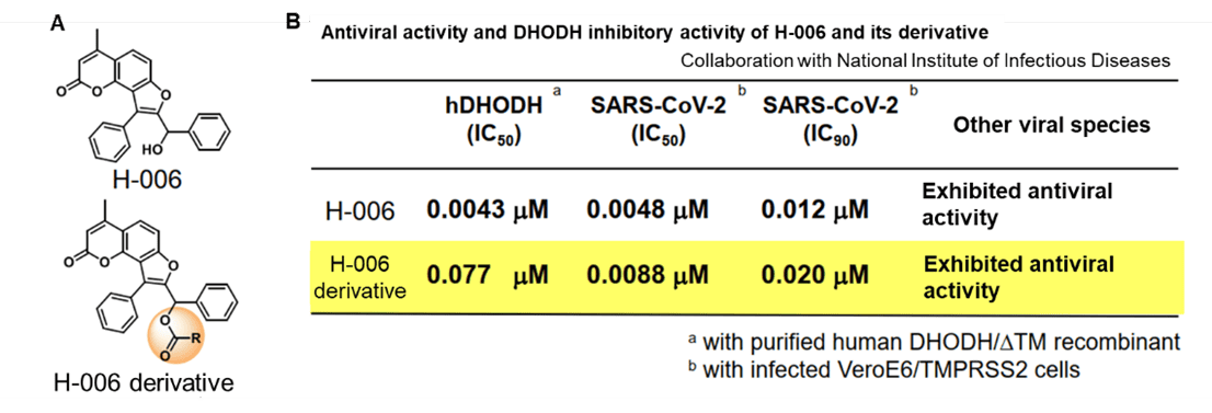 H-006は、既存のDHODH阻害薬よりも低濃度で強力な阻害活性を示し、がん細胞系に対しても増殖抑制活性を発揮し、SARS-CoV-2やエムポックスウイルス(MPXV)、デングウイルス(DENV)を含む各種ウイルスに対して増殖抑制効果が確認された。さらに、H-006を基にした誘導体の開発により、溶解性などの物性調整が可能となり、一部の誘導体はプロドラッグ様の活性も示した。現在、感染動物モデルを用いた試験を実施中である。