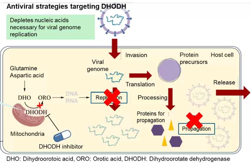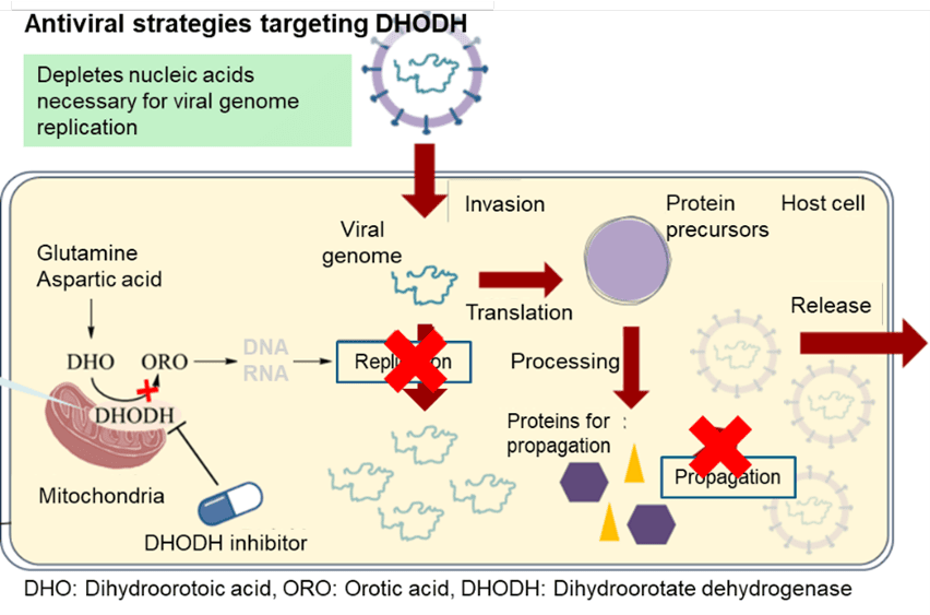 発明者らは、ヒトの代謝酵素であるDHODH(ジヒドロオロト酸脱水素酵素)を標的とする抗ウイルス薬として低分子化合物を開発した。DHODHは、DNAやRNAを構成するピリミジン系核酸類のデノボ生合成に関与している。DHODH阻害によって細胞内の核酸プールを枯渇させることで、核酸要求性の高いウイルス増殖が抑制される。また、サイトカインストームの原因となる過剰な免疫反応を抑制する効果も期待される。