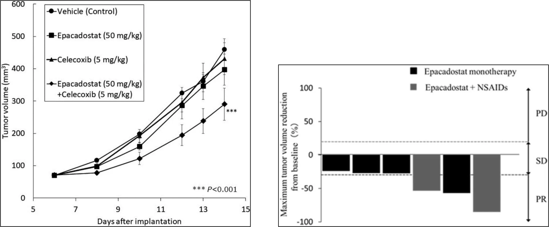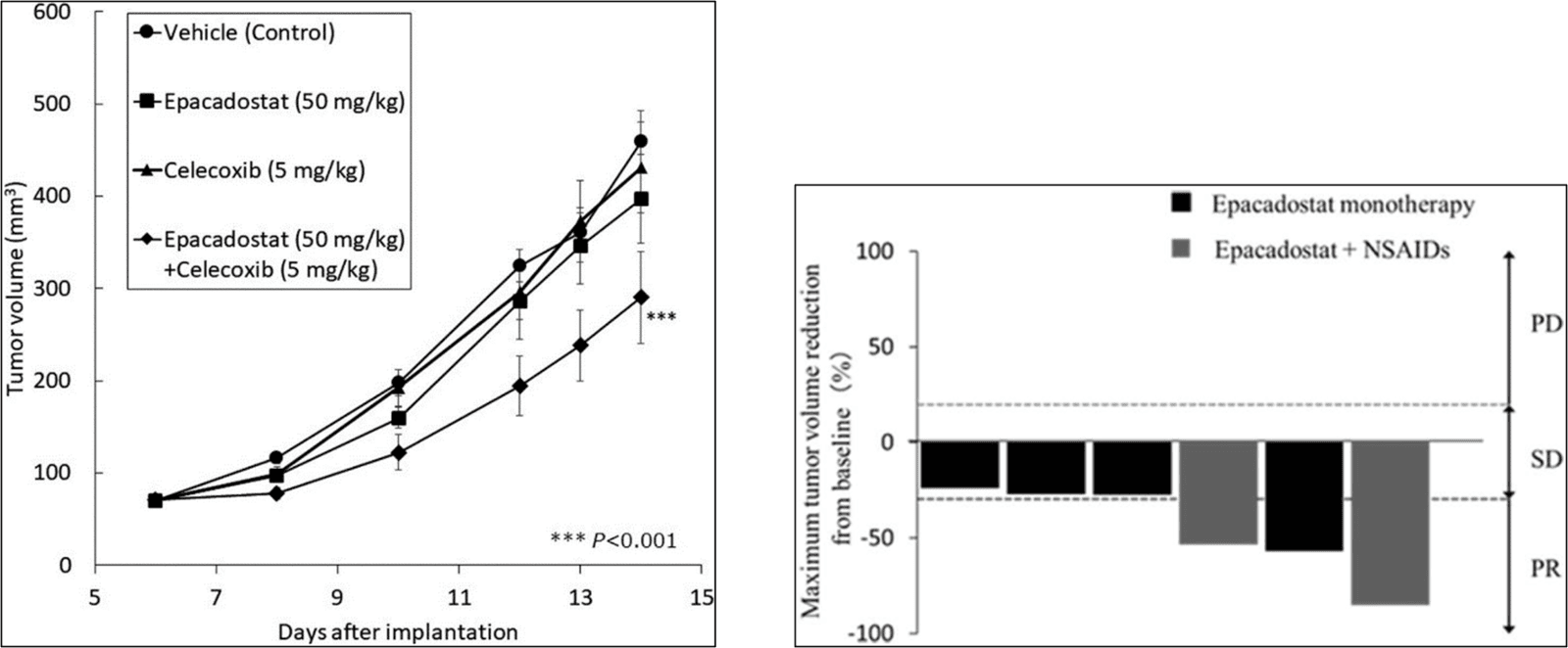 - T26-IDO1移植マウスモデルに対し、Epacadostat(50mg/kg)とCelecoxib(5mg/kg)を投与したところ、単剤では効果を示さなかったが、併用では効果が示された。