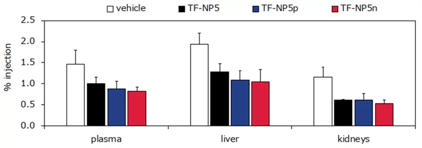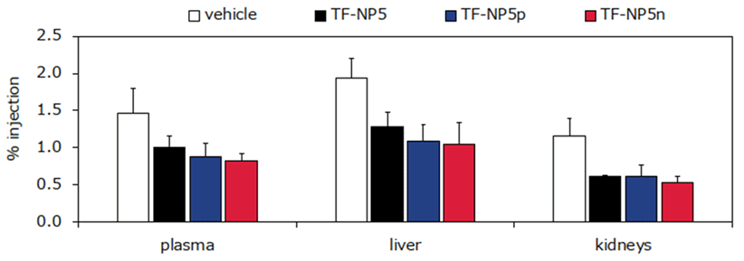 - 電荷の異なるナノ粒子(電荷なし:TF-NP5、正電荷:TF-NP5p、負電荷:TF-NP5n)を放射性標識したインドールとともに経口投与(5㎎/mouse)し6時間後の各臓器へのインドール由来物質の吸収を測定したところ、血漿、肝臓、腎臓において対照(Vehicle)群に比べて有意に低く、腎臓における蓄積は投与量の1%以下であった。