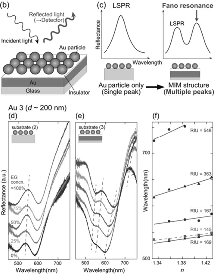 - 絶縁層を介して金コロイド結晶を金薄膜上に固定したMIM構造(b)、LSPR(localized SPR)に比べてMIM構造がFano共鳴により複数のプラズモンピークを生じ、高感度センシングを可能にする(C)。