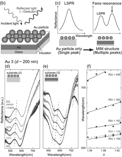 - 粒径約200 nmの金コロイドを用いた基板におけるエチレングリコール (EG) 濃度変化に対する反射スペクトルの変化、(d) は金コロイド/ガラス基板、(e) はMIM基板の結果を表す。(f) は、屈折率変化に対するプラズモンピークシフトを示し、MIM基板の方が約2倍の感度を持つことが確認された。