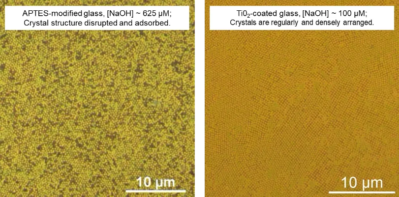 - 新しいガラス基板処理技術の導入:APTES修飾ガラスに代わり、TiO₂層を使用 することで、等電点の調整が容易になり、金コロイド結晶を規則的かつ緻密に配列できる吸着技術を実現。