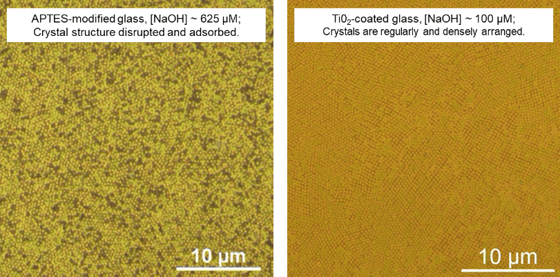 金粒子が規則的に配列したコロイド結晶は、プラスモニック材料として優れた特性を持ち、分析・測定用のSPR基板としての応用が期待されている。通常、コロイド結晶をガラス基板に吸着させるには、ガラス表面をAPTES(アミノプロピルトリエトキシシラン)で処理して正に帯電させたうえで、負に帯電したコロイド結晶溶液を滴下する。この過程では、pHを等電点(pH8)以上に調整する必要があり、そのために高濃度のアルカリ(NaOH)の添加が必要となる。しかし、アルカリ添加により塩濃度が上昇すると、コロイド結晶の構造が不安定になり、均一な結晶構造を維持したまま吸着させることが困難になる課題があった。