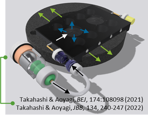 本発明者は、この問題を解決するために電源不要の換気ポンプNeBP(non-electric bellows pump)を開発した 。NeBPは、振盪機の揺れのエネルギーを利用して自動的にガスをポンピングするガス交換デバイスである。既存の三角フラスコなどに接続するだけで、容器内のガスを能動的に循環させ、培養効率を改善できることが示されている。さらに、このNeBPポンプをプレート培養に応用するためのガス制御マイクロプレートを開発した。このプレートは、NeBPから送られるガスを各ウェルに均一に分配すると同時に、内部の加湿機構で培地の揮発を劇的に抑制する。これにより、多検体スクリーニングにおいて、従来は専用の高価な装置でしか実現できなかった高精度なガス環境制御を、低コストかつ簡便に行えるようになった。