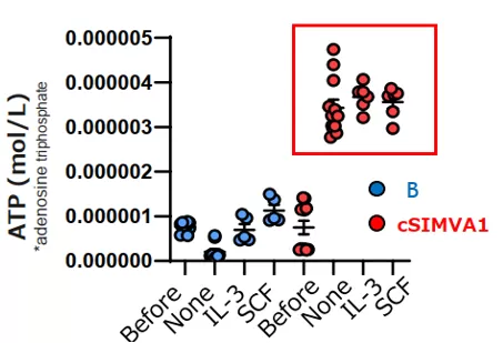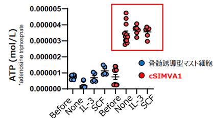 - マウスの骨髄細胞由来マスト細胞とcSIMVA1を用いて、コントロール(None)とIL-3、SCFを添加時の細胞内のATP濃度(増殖率)を測定したところ、cSIMVA1ではすべてのグループでATP濃度が上昇し、細胞が増殖していることを確認した。(Beforeは実験前のATP濃度)