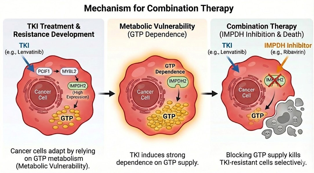 独自のスクリーニング系と標的同定:発明者らは、レンバチニブに高度な耐性を示す新規肝癌細胞株「C3B」を樹立した。この細胞株を用いたCRISPR-Cas9ゲノムワイドスクリーニングを実施し、数万の遺伝子の中からレンバチニブ耐性の鍵を握る遺伝子としてPCIF1とその下流のIMPDH2を特定することに成功した。