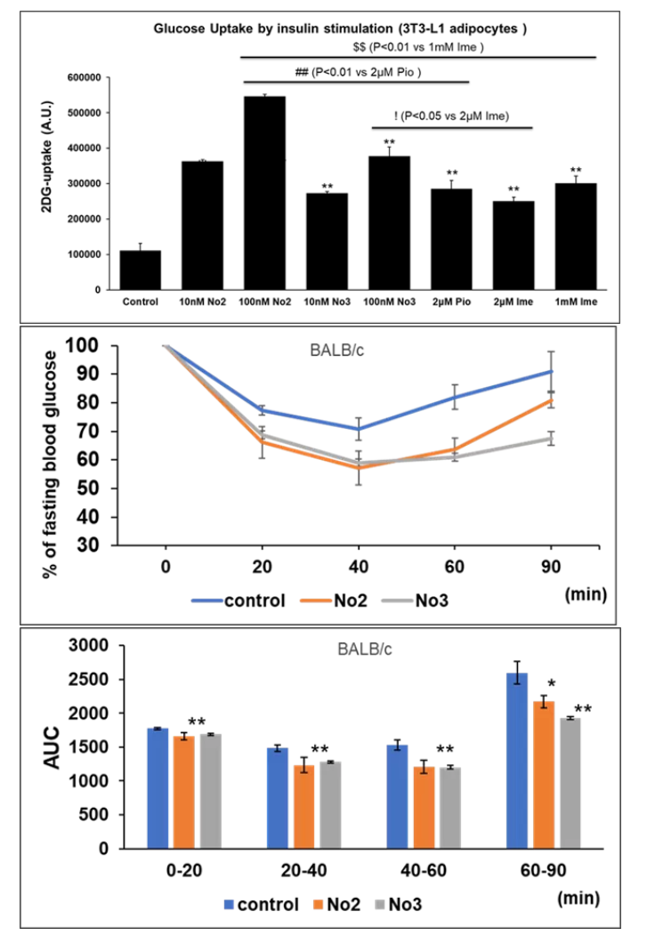 本発明者らは、インドール構造を基盤とした新規化合物を設計・合成した。得られた複数の誘導体(化合物No.2およびNo.3)は、培養脂肪細胞においてインスリン刺激下での糖取り込みを顕著に促進し(図1)、動物モデルではインスリン負荷試験における血糖低下作用を示した(図2)。また、ピオグリタゾンやイメグリミンと比較しても、より低濃度で同等以上の活性を発揮し、マウスの実験において副作用も認められなかったことから、本化合物は既存薬とは異なる分子標的や経路に作用している可能性が示唆される。