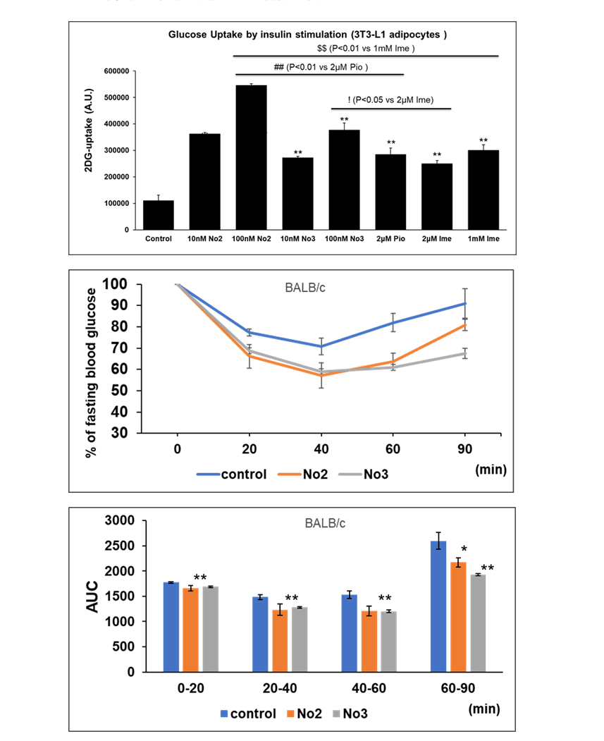 - 培養脂肪細胞に本化合物No.2、No.3、ピオグリタゾン、イメグリミンを添加し48時間培養した後にインスリン刺激(10nM、10分間)による糖取り込みを確認したところ、いずれもコントロールと比較して有意に糖取り込みを促進し、新規化合物はピオグリタゾン、イメグリミンよりも低濃度で糖取り込み能を促進することが示された(図1)。